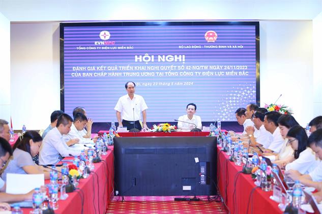 Sáng ngày 23/5, tại Hà Nội, Tổng công ty Điện lực miền Bắc phối hợp với Bộ Lao động – Thương binh và Xã hội tổ chức Hội nghị đánh giá kết quả triển khai Nghị quyết số 42-NQ/TW ngày 24/11/2023 của Ban Chấp hành Trung ương Đảng khóa XIII tại Tổng công ty Điện lực miền Bắc. Thứ trưởng Bộ LĐTBXH Nguyễn Văn Hồi và Tổng Giám đốc Tổng công ty Điện lực miền Bắc Nguyễn Đức Thiện tham dự và đồng chủ trì Hội Nghị. Tham dự Hội nghị có đại diện các Ban chuyên môn của Tổng Công ty Điện lực miền Bắc cùng đại diện Lãnh đạo của các đơn vị liên quan thuộc Bộ.
