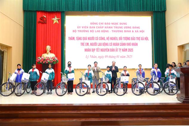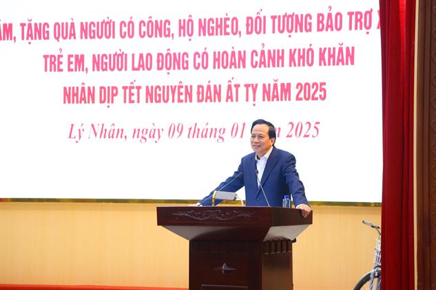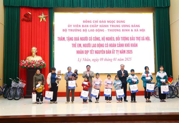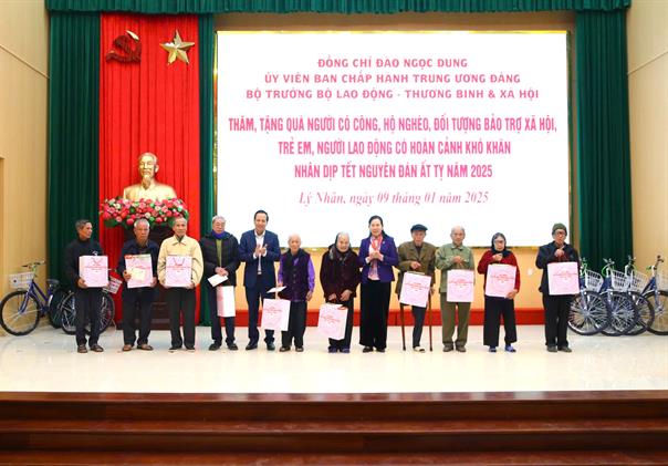 Sáng ngày 09/01, nhân dịp chuẩn bị đón Tết Nguyên đán Ất Tỵ 2025, Đoàn công tác của Bộ Lao động - Thương binh và Xã hội do Bộ trưởng Đào Ngọc Dung làm trưởng đoàn đã về thăm, tặng quà động viên gia đình chính sách và trẻ em trên địa bàn huyện Lý Nhân, tỉnh Hà Nam.